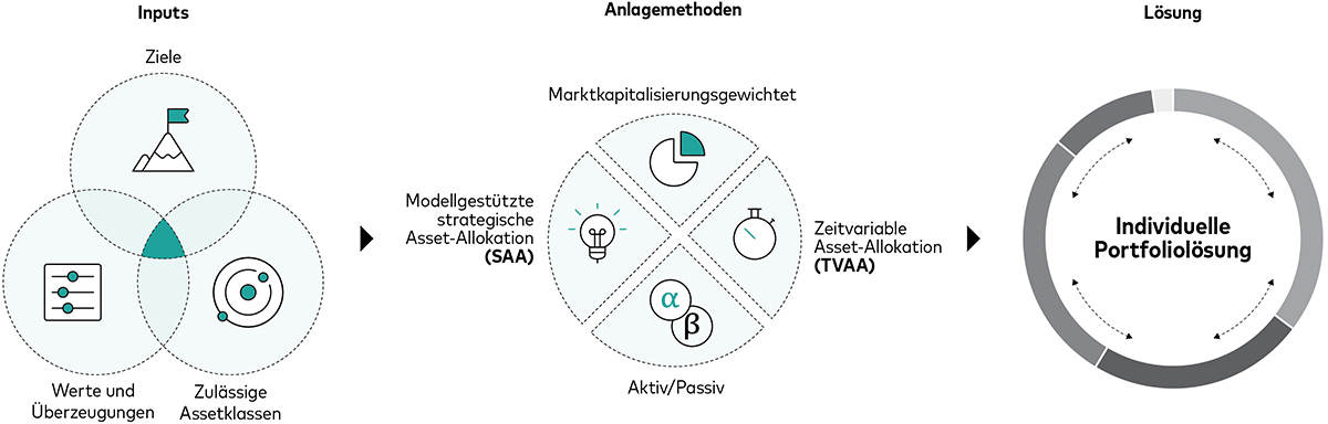 Um eine Portfolio-Empfehlung auszusprechen, muss zunächst das spezifische Ziel der Anlegerin oder des Anlegers definiert werden (in den meisten Fällen Kapitalwachstum, Risikoabsicherung oder eine bestimmte Rendite). Wie im Folgenden dargestellt, möchten Anlegerinnen und Anleger bei der Umsetzung ihrer Ziele möglicherweise auch bestimmte Wünsche oder Einschätzungen zum Ausdruck bringen, etwa ESG-Präferenzen oder die Überzeugung, dass ein bestimmter aktiver Manager, bestimmte Faktorprämien oder zeitvariable Renditeerwartungen zum Ziel führen.