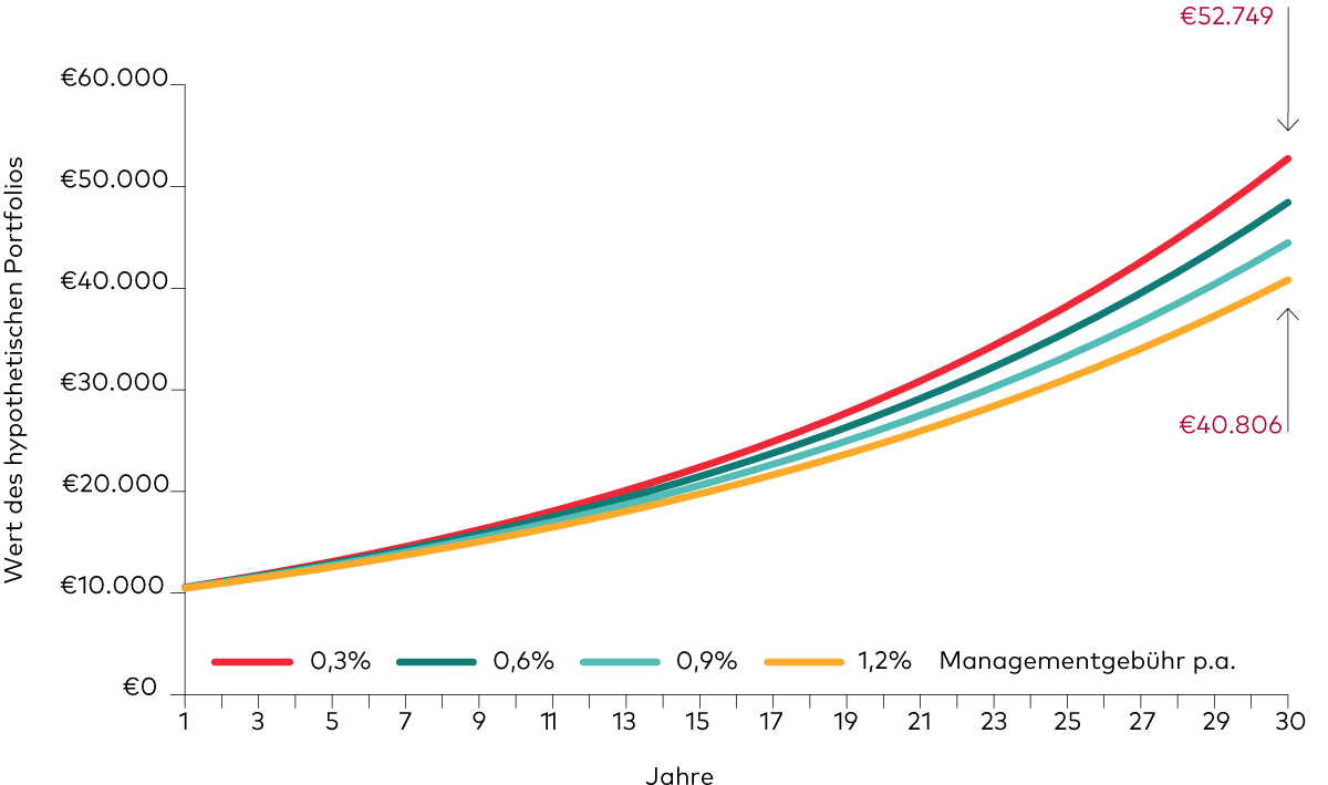 Anlegerinnen und Anleger können ihre Chance auf Mehrrenditen erhöhen, indem sie überwiegend kosteneffiziente Anlagelösungen nutzen. Die nachstehende Grafik zeigt, wie sich Kosten über einen Anlagehorizont von dreißig Jahren auf die Rendite eines Portfolios im Wert von 10.000 Euro auswirken können. Geht man von einer durchschnittlichen jährlichen Wachstumsrate von 6% aus, würden Kundinnen und Kunden mit Fondsgebühren von 0,3% gegenüber einer Kostenquote von 1,2% 11.943 Euro sparen.