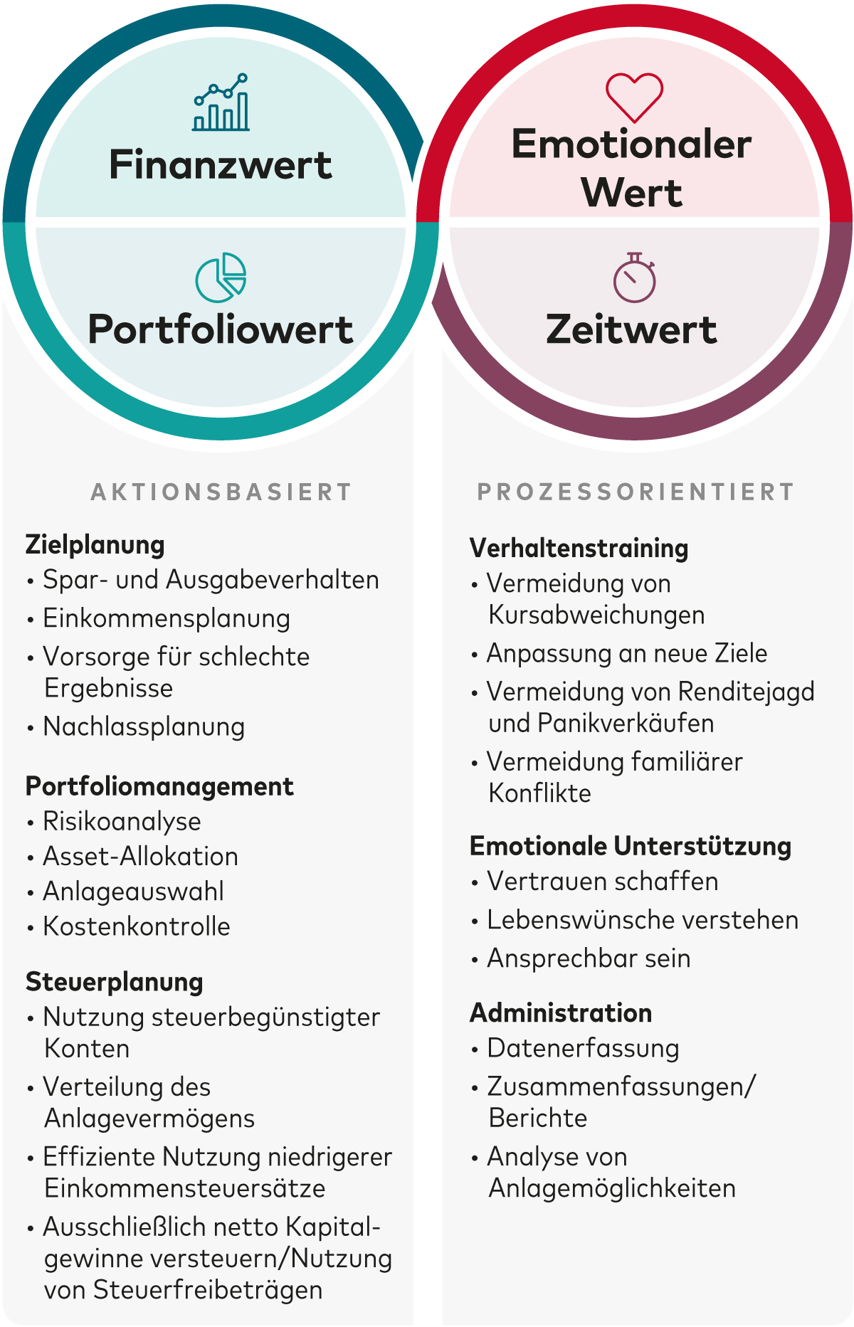 Der Finanz- und Portfoliowert bemessen sich meist an konkreten Maßnahmen, die Beraterinnen und Berater ihren Kundinnen und Kunden empfehlen; der emotionale Wert und der Zeitwert einer Beratung sind dagegen das Ergebnis eines kontinuierlichen Prozesses und entstehen durch regelmäßigen Kundenkontakt und laufende Portfoliokontrolle. Durch diesen regelmäßigen Austausch verdienen Sie sich das Vertrauen Ihrer Kundinnen und Kunden, und Vertrauen ist eine der wichtigsten Voraussetzungen für erfolgreiche langfristige Beziehungen.